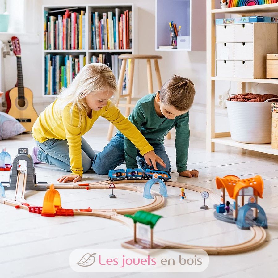 "Tutti a bordo!" I treni sono pronti a lasciare la stazione Smart Tech Sound 33973. Se utilizzata con la locomotiva con registratore vocale Smart Tech Sound (non inclusa), la stazione ordina al treno di rallentare fino a fermarsi completamente, accende le luci per segnalare il suo arrivo e riproduce il suono della stazione per creare un'atmosfera vivace. Utilizzate l'app Smart Tech Sound per cambiare l'annuncio della stazione e dare il benvenuto ai passeggeri a : Berlino, Londra o Parigi. Ora che il treno si è fermato, aiutate i passeggeri a sistemarsi nell'abitacolo e iniziate il vostro viaggio nel mondo BRIO.