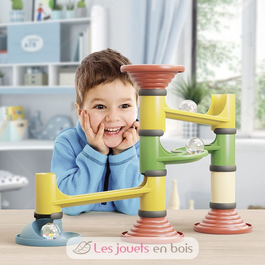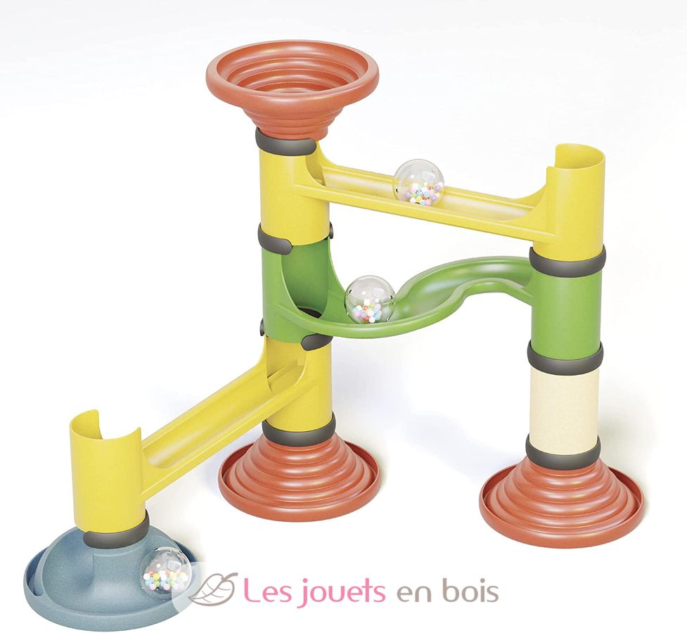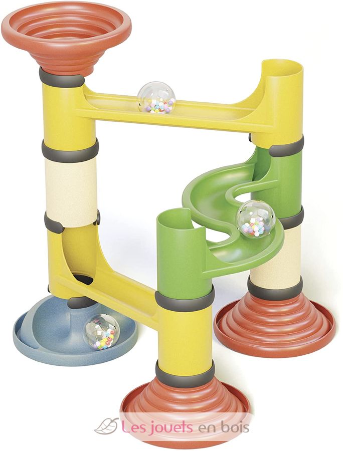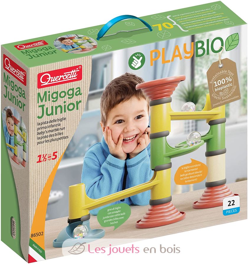 Migoga Junior unisce il divertimento delle piste di marmo al rispetto per l'ambiente grazie all'utilizzo di un'esclusiva Bio-plastica. La pista è progettata per una discesa lenta, in modo che i bambini più piccoli possano seguire facilmente il percorso delle 3 palline fornite con il giocattolo. Diametro delle sfere: 4,5 cm.