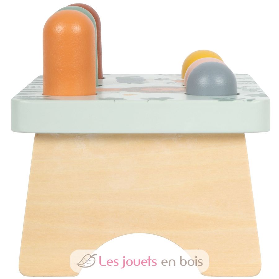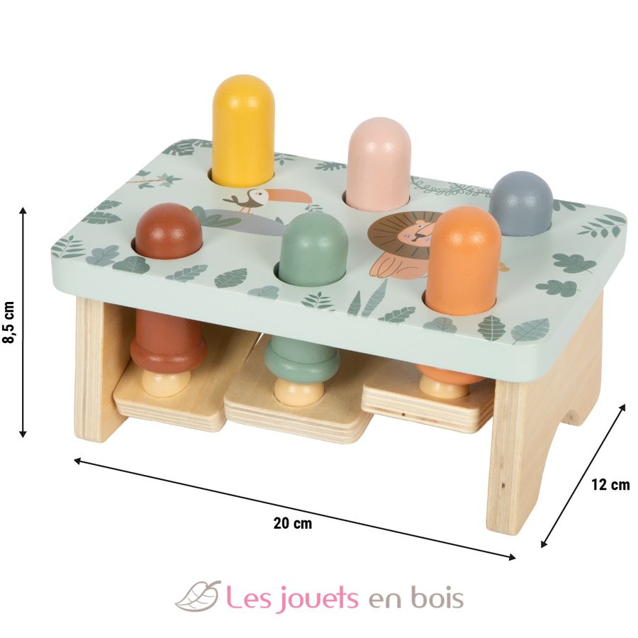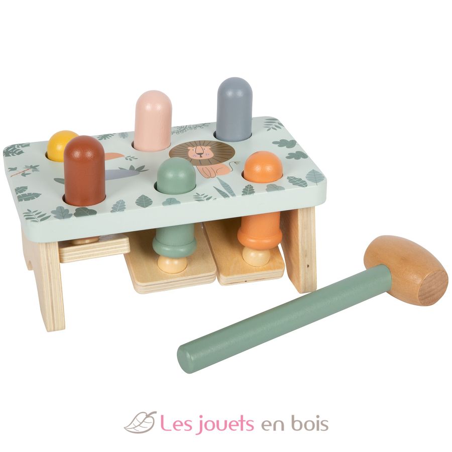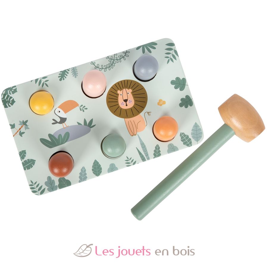 Questo gioco con martelletto realizzato con cura in legno FSC certificato, dal design a tema Safari, invita i bambini a colpire con il martelletto i bastoncini di legno che escono dalla panca.
