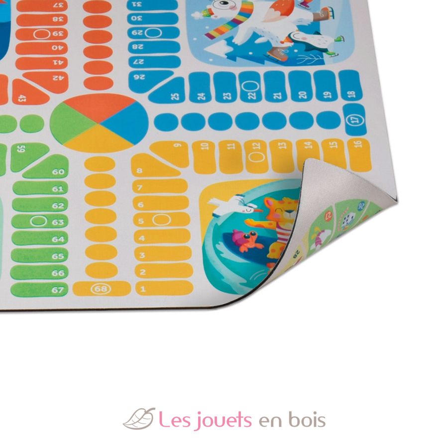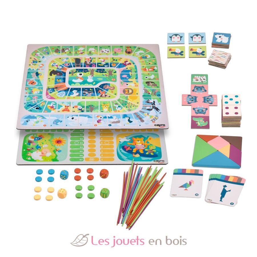 Contenuto: 1 tabellone di gioco reversibile in neoprene (32 x 32 cm), 28 robuste tessere del domino in cartone, 16 robuste carte Memory in cartone, 7 pezzi del tangram in plastica con 10 carte modello, 28 bastoncini del Mikado, 16 pedine colorate, 4 dadi e un libretto di istruzioni.