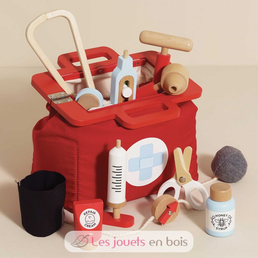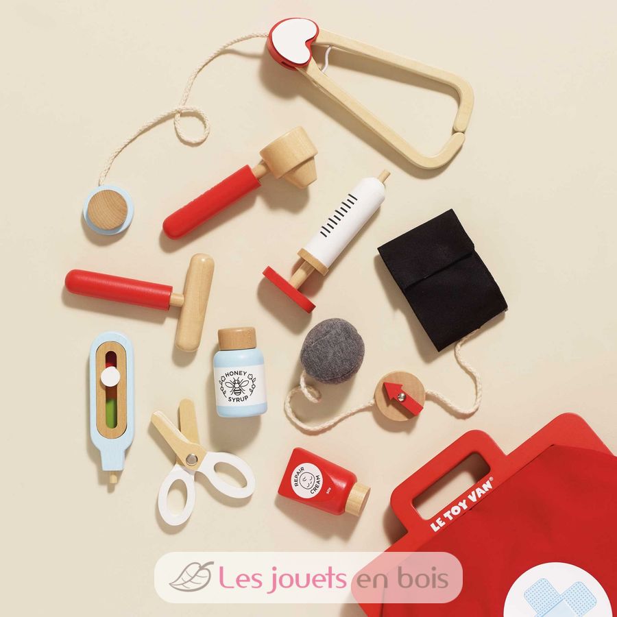 Dottore! dottore! Una borsa di stoffa in stile vintage, a misura di bambino, piena di vari strumenti medici e accessori in legno. Il set comprende stetoscopio, termometro, siringa, misuratore di pressione, otoscopio per le orecchie, martello per i riflessi, forbici e due flaconi di medicinali. A partire dai 3 anni. Un giocattolo del marchio Le Toy Van rif: TV292.