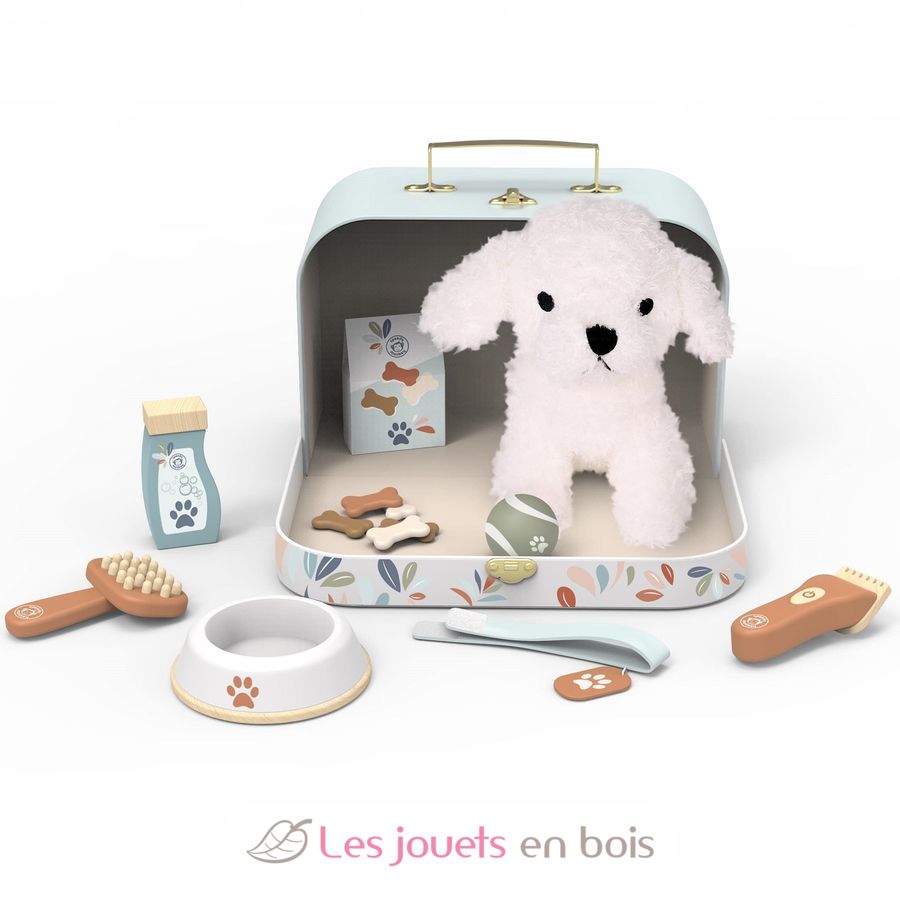 In questa valigetta dal design accattivante, i bambini avranno tutto il necessario per prendersi cura del loro cagnolino di peluche preferito (incluso).