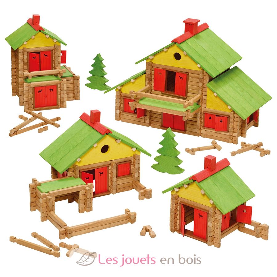 Un gioco di costruzioni in legno naturale e colorato di 330 pezzi, con istruzioni di montaggio per imparare a costruire un autentico chalet in legno.