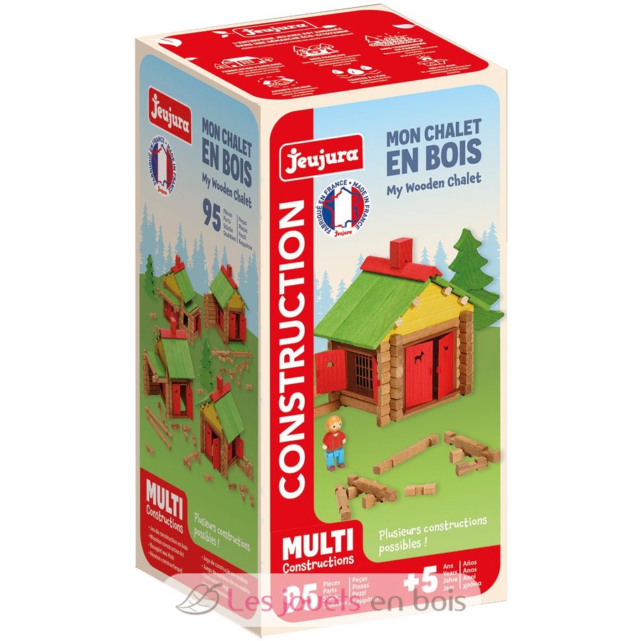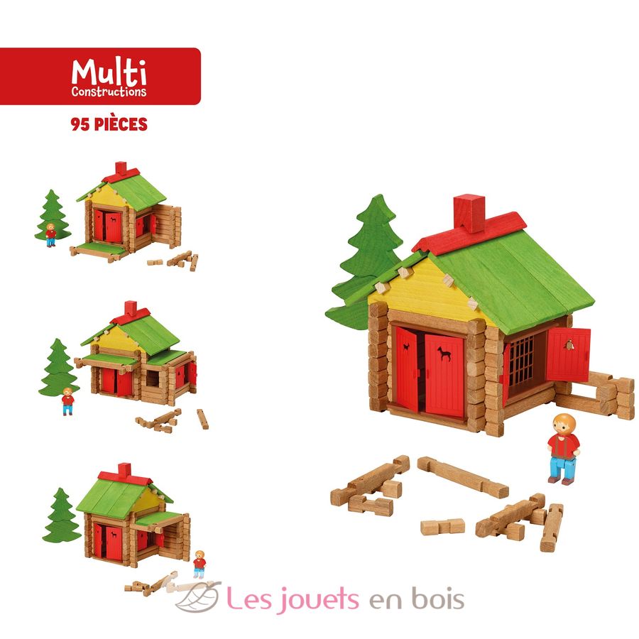 Un gioco di costruzioni in legno naturale e colorato di 95 pezzi, con istruzioni di montaggio per imparare a costruire un autentico chalet in legno.