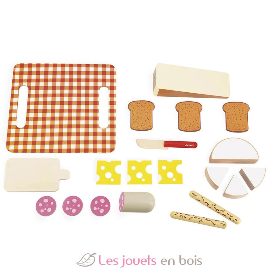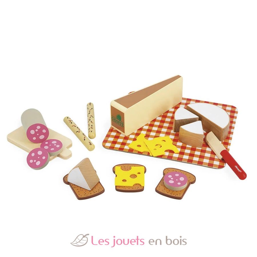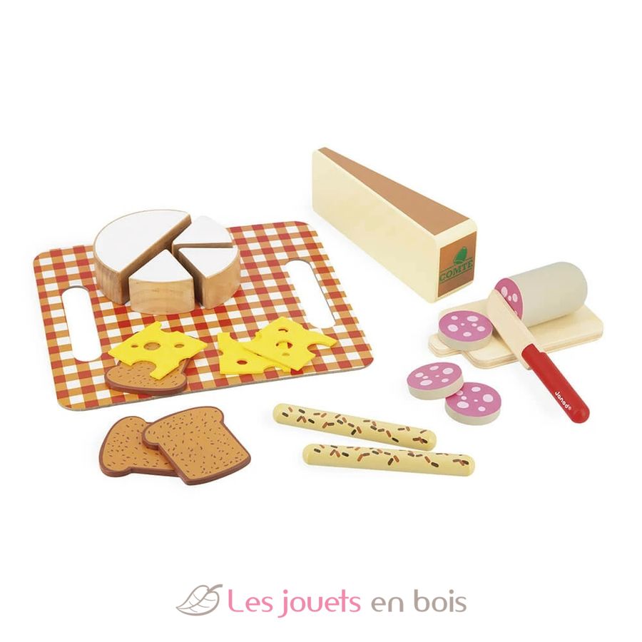 Grazie a questo originale kit per bambini, anche i più piccoli potranno preparare un aperitivo delizioso e trascorrere un pomeriggio di svago! Questo set offre ai piccoli buongustai un menu tipicamente francese: un formaggio con due fette pre-tagliate, tre fette di pan carré, due grissini, una salsiccia con 3 fette in legno e tre fette di emmental in feltro giallo. Naturalmente, anche il prelibato formaggio Comté fa parte di questo divertente giocattolo di imitazione. Il tutto può essere presentato sul vassoio in cartone a quadretti rossi e bianchi o sul tagliere in legno. In più, il coltello incluso permetterà ai bambini di tagliare e spalmare come i grandi!