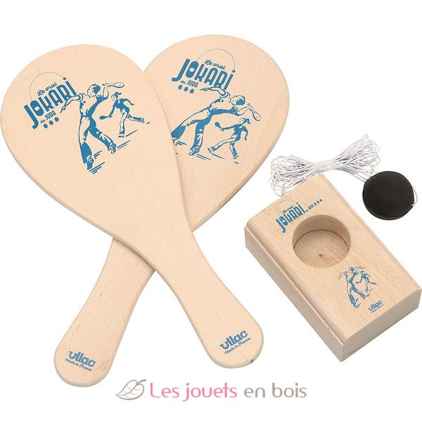 Jokari è un gioco che può essere giocato da soli o in coppia. È composto da due racchette e una pallina di gomma fissate alla base di legno tramite un elastico. La palla ritorna ai giocatori dopo essere stata colpita con la racchetta! Molto pratico, questo jokari in legno massello di faggio si ripone nella sua borsa di cotone per portarlo facilmente ovunque!