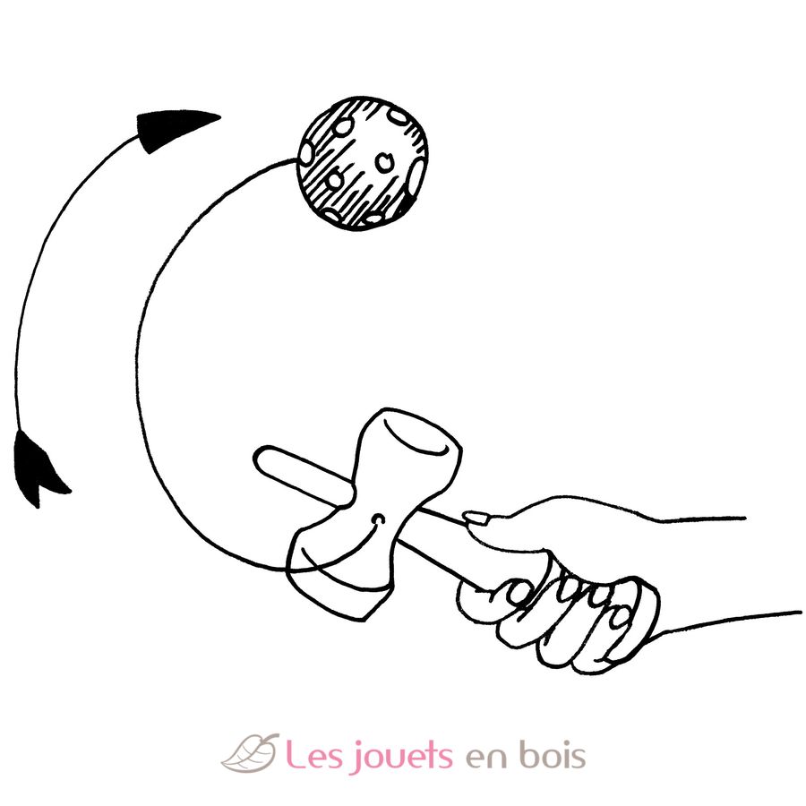La sfera di legno è appesa ad una corda legata ad una maniglia in legno massiccio dotata, a sua volta, di due avvallamenti e di uno stelo. La mano afferra la maniglia e fa volare la sfera verso l’alto, la sfera atterra in uno dei due avvallamenti, viene infilzata o, cosa più probabile, ciondola vicino alla maniglia.