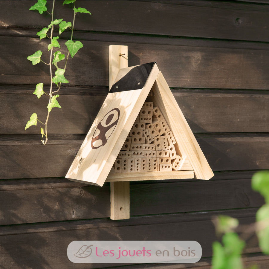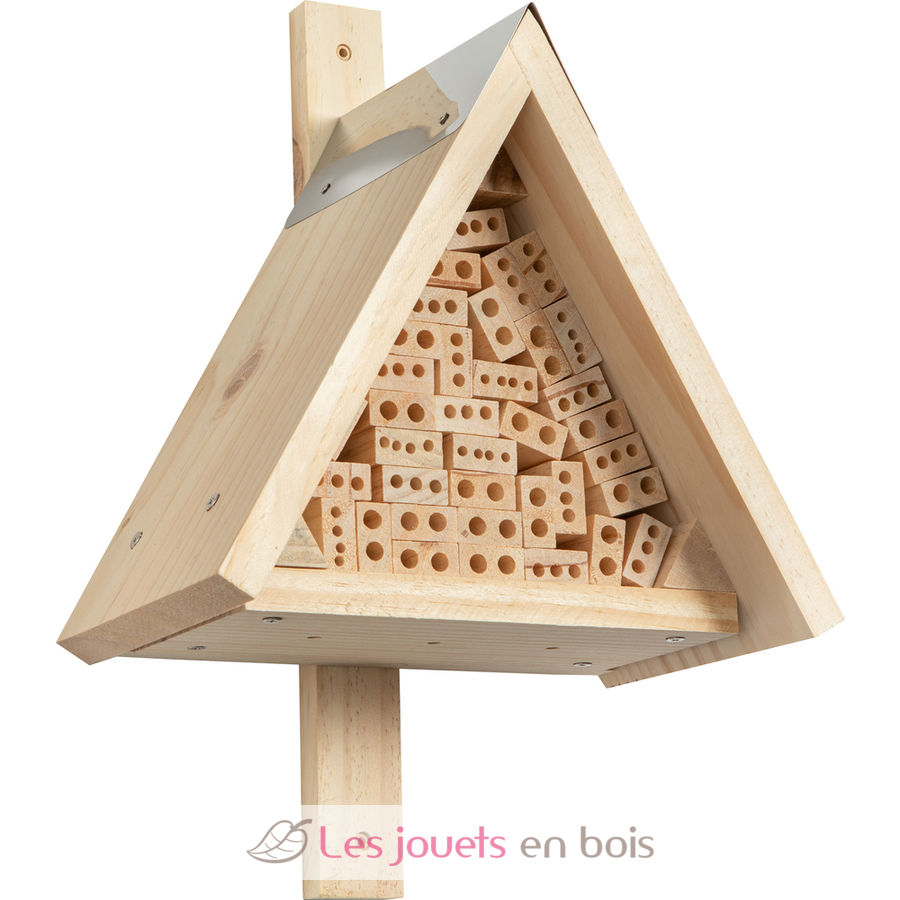 Qui gli insetti benefici troveranno una casa accogliente per deporre le uova. L'involucro dell'hotel è finito in un batter d'occhio, poiché solo le parti in legno devono essere avvitate insieme. Una lastra di metallo protegge il timpano dall'umidità. Vengono forniti pezzi di legno preforati per abbellire l'interno, e i bambini potranno cercare da soli altri materiali di riempimento (rametti, paglia, argilla, gusci di lumaca...) nella natura.
