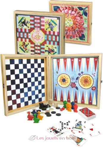 Questa bellissima scatola di giochi in legno a tema bucolico, illustrata da Nathalie Lété, contiene 5 giochi da tavolo: dama, cavallino, baggamon, gioco dell'oca e gioco delle carte.