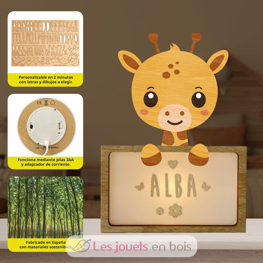 Il kit include: 1 lampada in legno e metacrilato con illuminazione a LED; 1 foglio di lettere e simboli in legno autoadesivi. Dimensioni: 16,7 x 16,9 x 6 cm. Area personalizzabile: 11 x 6 cm.