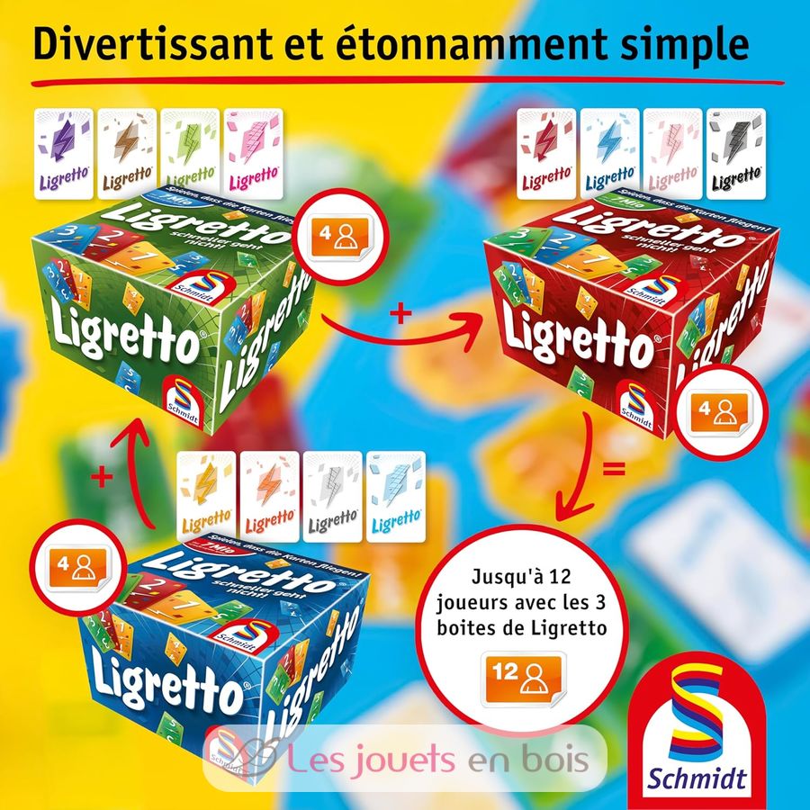 Combinando due giochi base Ligretto di colori diversi (disponibili in blu, verde e rosso), possono partecipare fino a 8 giocatori. E se si utilizzano tutti e tre i set di colori diversi, possono giocare fino a 12 giocatori.