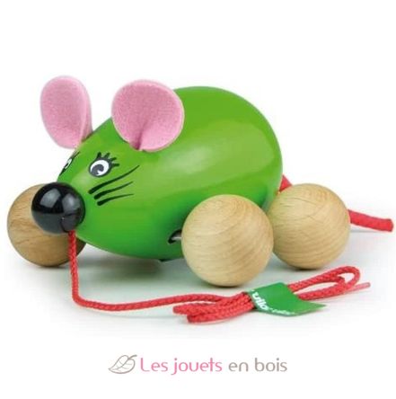 Grazioso topolino verde in legno, un giocattolo da tirare prodotto in Francia nel Giura da Vilac.