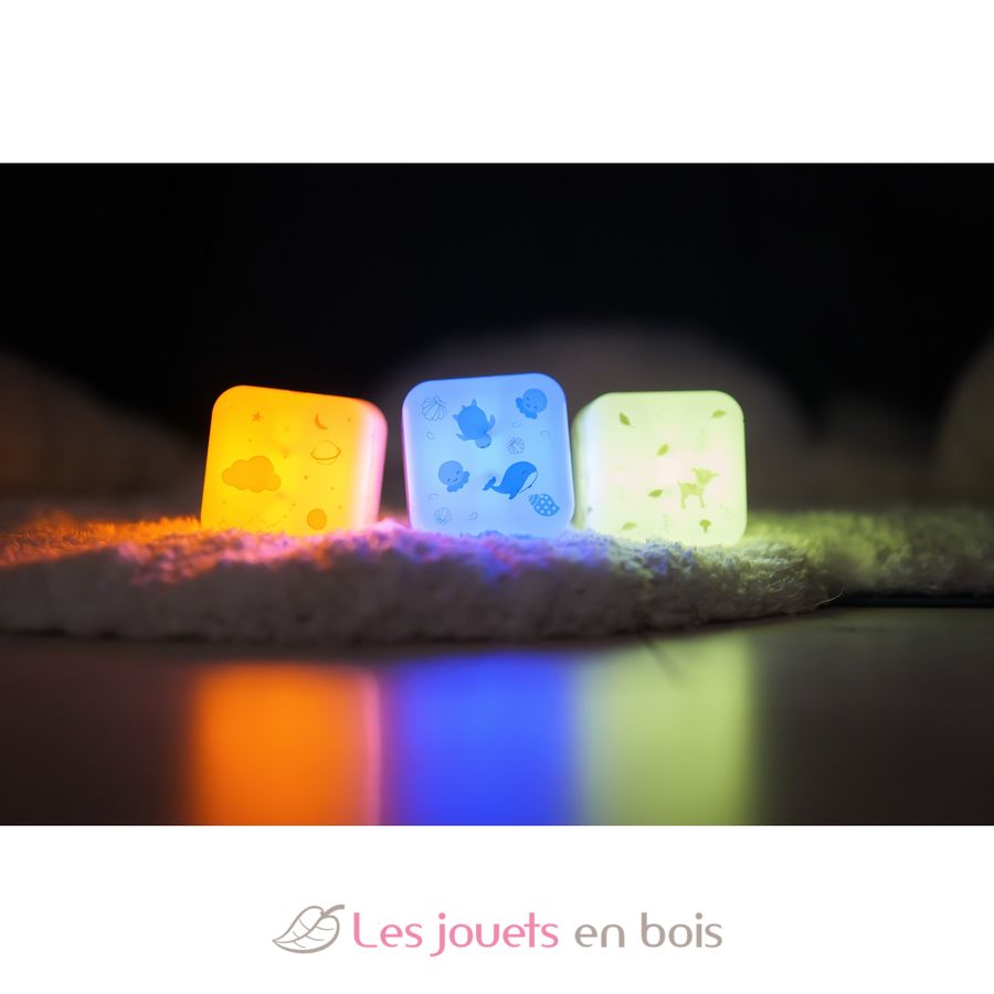 La luce notturna da parete o mobile Cube b è la compagna luminosa delle notti dolci e serene, fin dalla nascita. È realizzato al 30% in plastica riciclata e si ricarica direttamente dalla rete elettrica.