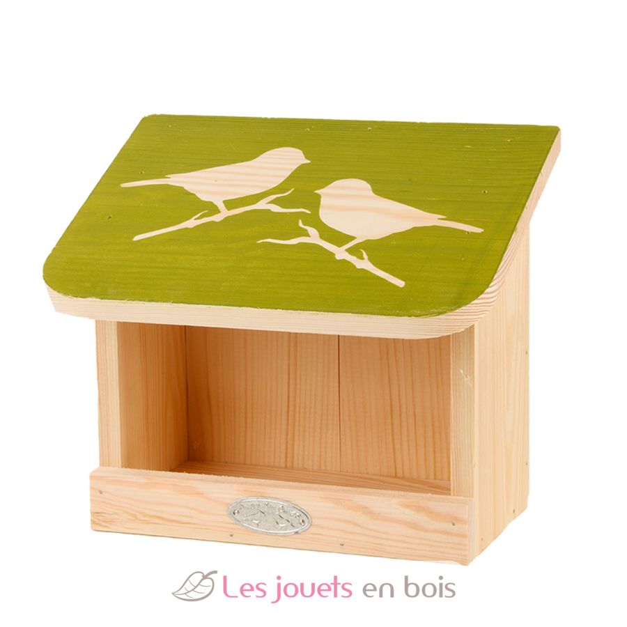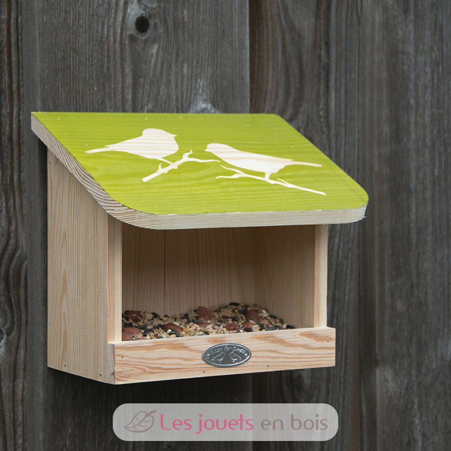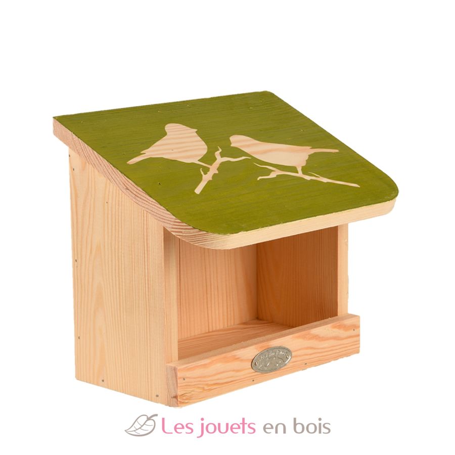 Questa mangiatoia per uccelli è una graziosa mangiatoia in legno di pino con un tetto colorato decorato con la sagoma di un uccello.