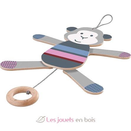 Un grazioso burattino in legno a forma di scimmia. Basta tirare l'anello per far muovere le gambe della scimmia.