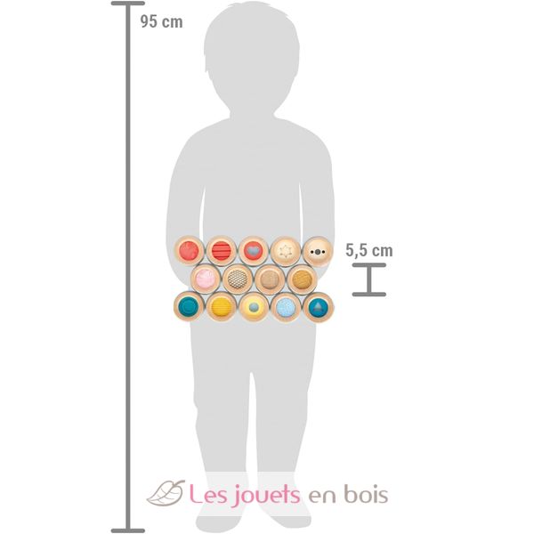 I 28 elementi di gioco in legno hanno 14 superfici diverse che devono essere toccate e riconosciute. Sette paia in tessuto e sette paia con disegni in legno di diverse forme si differenziano per struttura, materiale, forma e colore.