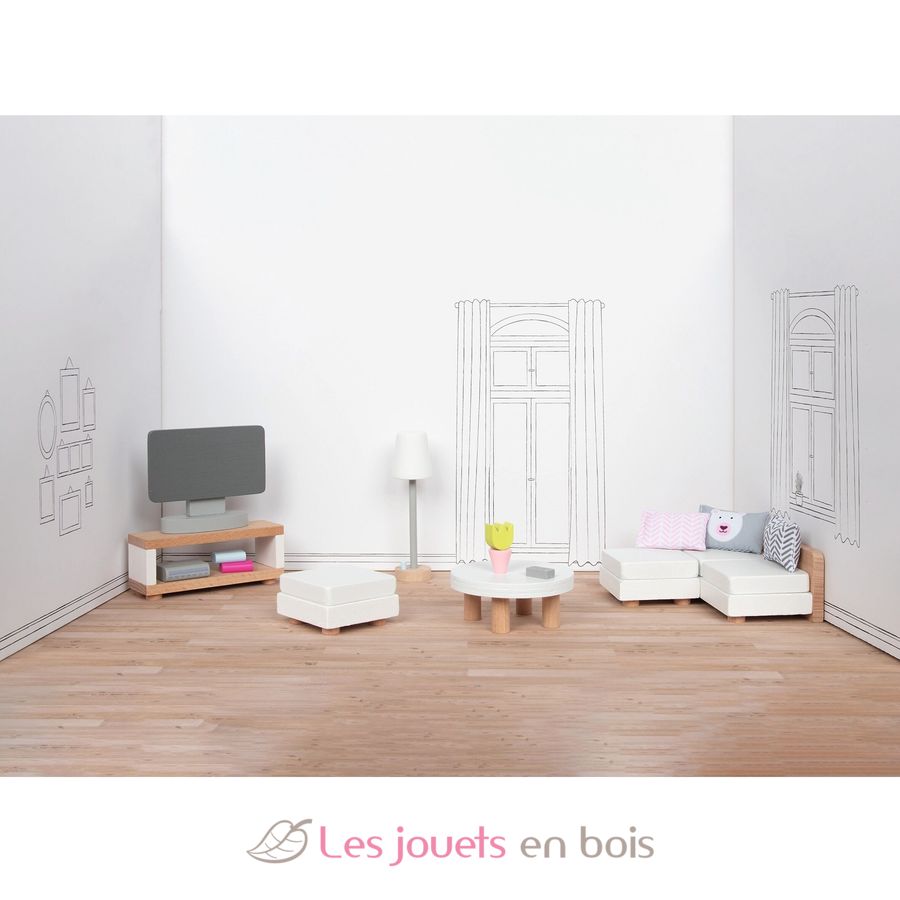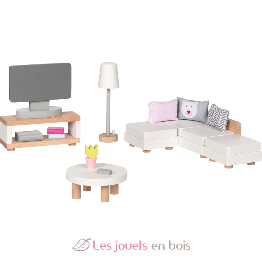 Questo set di accessori in legno per soggiorno si adatta perfettamente a una casa delle bambole.