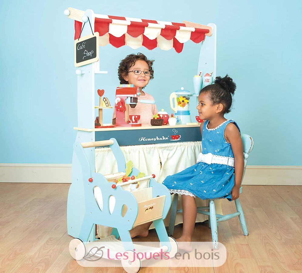 Questa area gioco reversibile 2 in 1 è stata progettata per un gioco di ruolo immersivo: un po' bancarella del mercato e un po' caffetteria o bistrot.