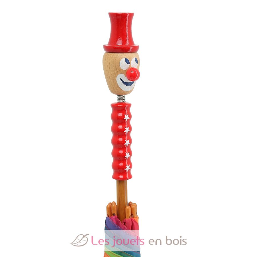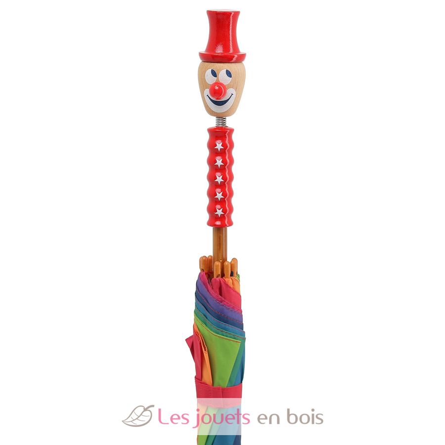 Anche sotto la pioggia, il clown indossa il suo grande cappello rosso e continua a sorridere! Un ombrello robusto e colorato per rallegrare le giornate di pioggia.