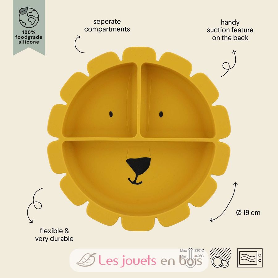 Questo splendido piatto in silicone è dotato di una pratica ventosa per aderire facilmente alle superfici piane. Mai più piatti rovesciati! È inoltre suddiviso in diversi scomparti per aiutare il bambino a distinguere alimenti, sapori e consistenze.