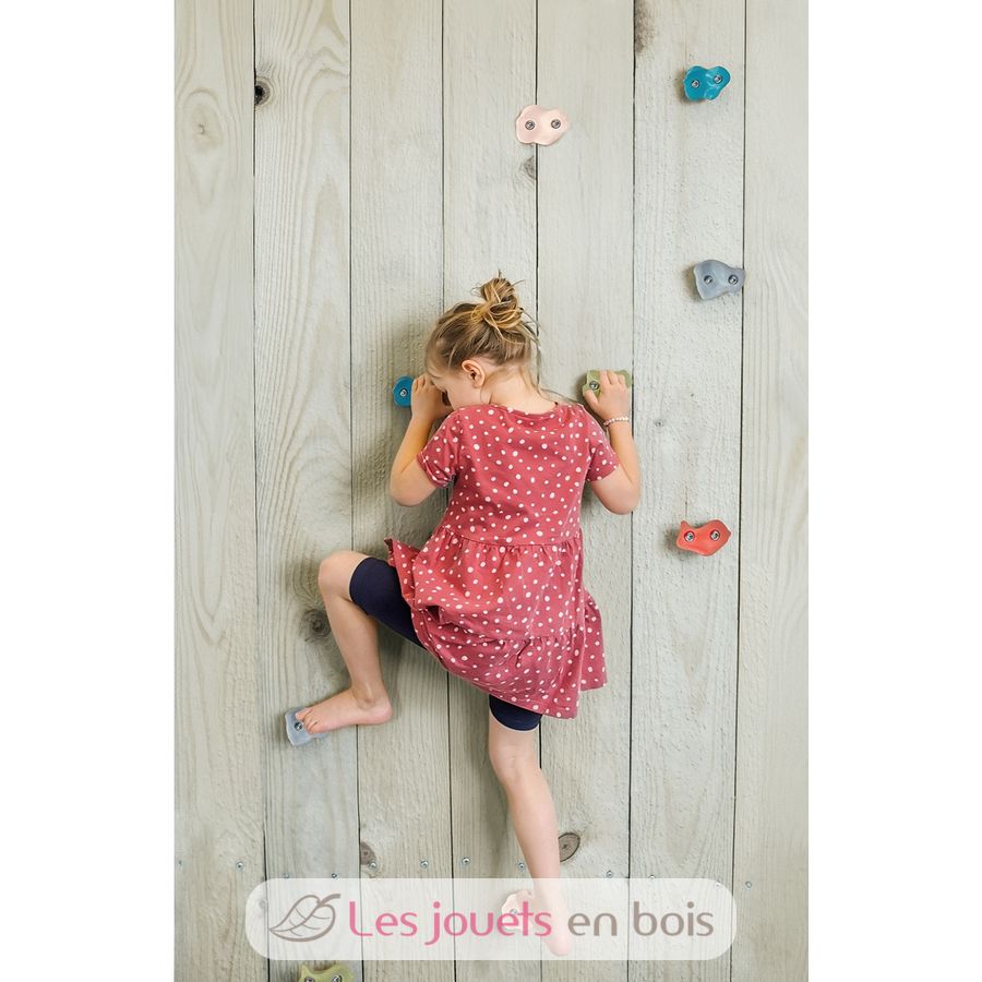 Questo set formato da 5 rocce per arrampicata di forme diverse in stabile plastica porta divertimento in colori moderni su ogni parete.