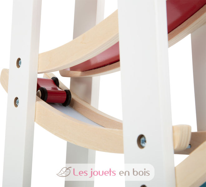 Pronti, partenza, via! Questa pista di legno con una base stabile promette un gioco scattante, grazie alle quattro automobiline in legno che sfrecciano verso il basso lungo le rampe. Durante il percorso da un piano all'altro, compiono curiose capriole, divertendo un mondo. Il legno laccato di bianco e naturale, assieme al classico design delle rampe si inserisce con discrezione nell'arredamento della cameretta.