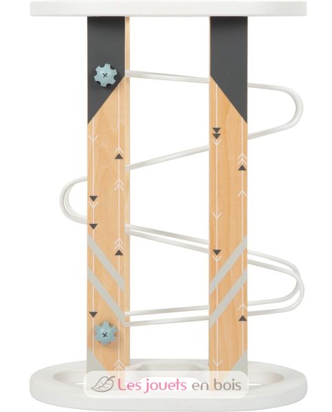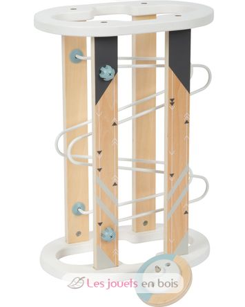 Questa pista di biglie soddisfa pienamente gli occhi grazie al suo affascinante effetto magnetico, nel momento in cui il grande elemento girevole rotola scattante su e giù! La pista di biglie dal design scandinavo è una vera attrazione nella stanza dei bambini grazie alla sua colorazione discreta con alto contenuto visibile di legno naturale. Con un po' di abilità, la pratica pista di biglie può essere posizionata in modo che l'elemento rotante rotoli in un ciclo infinito - così il gioco duraturo e il divertimento motorio sono garantiti! Particolarmente stabile grazie all'ampia base!