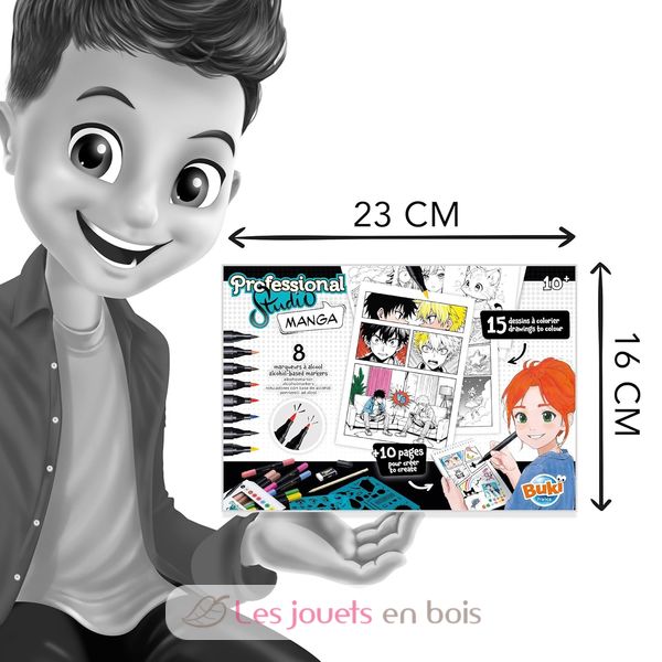 La scatola Professional Studio Manga contiene: un quaderno A5 con 25 fogli staccabili, di cui 15 manga da colorare e 10 fogli bianchi, 8 pennarelli ad alcol, 1 matita, una gomma, due fogli di stencil e un foglio di adesivi.
