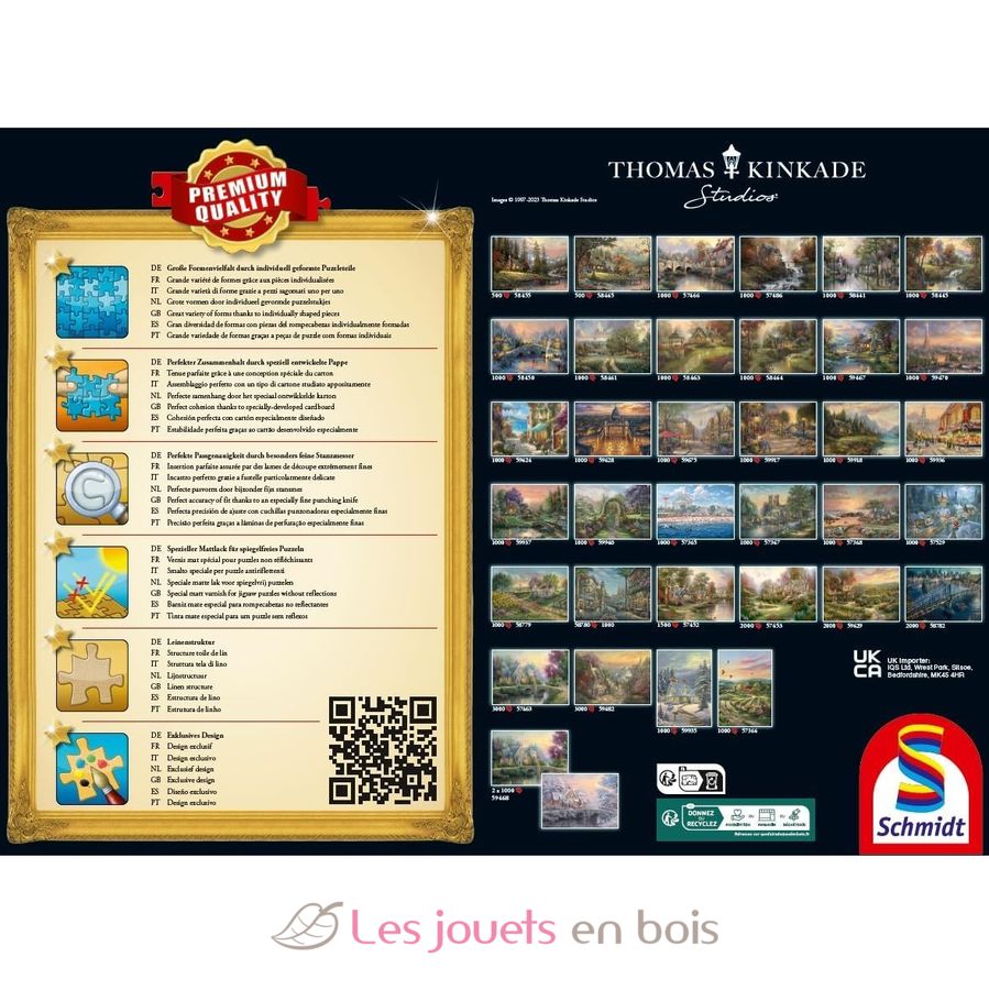 I puzzle Schmidt Spiele sono puzzle premium, realizzati in Europa. La loro qualità e finitura garantiscono un perfetto adattamento delle parti e un piacere di gioco duraturo.