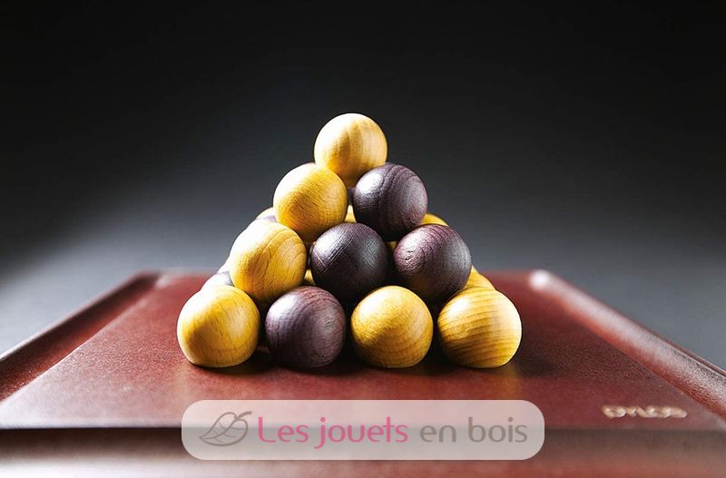 Ai due giocatori vengono date 15 biglie ciascuno che devono disporre a turno sul tabellone, a forma di piramide. Due semplici principi permettono di salvare le biglie: