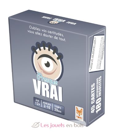 Venite a ridere con il gioco Presque Vrai! Dimenticate le vostre certezze, dubiterete di tutto. Ogni carta contiene un'informazione del tutto insolita: sta a voi indovinare se è vera, falsa o quasi vera! Non affidatevi solo alla conoscenza generale e all'attualità, ma anche al vostro buon senso!