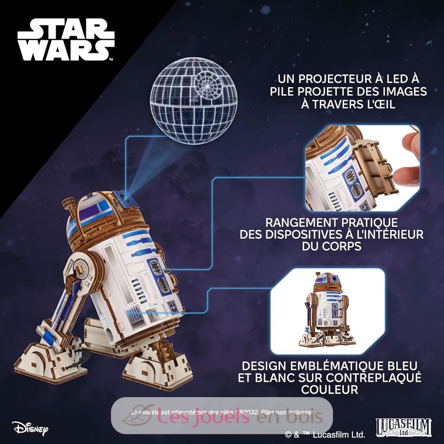 Costruisci il tuo R2-D2, un modello 3D in legno con gambe mobili, movimento a molla e un vero proiettore LED.