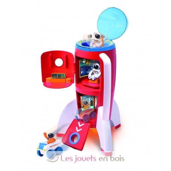 Il razzo ha 2 piani, quindi le porte si aprono. Al primo piano, possibilità di parcheggiare il mini rover in dotazione. Al secondo piano, installa l'astronauta sul sedile e usa la leva per spostare il sedile verso l'alto nella cabina di pilotaggio. Il sedile ruota di 360 gradi.