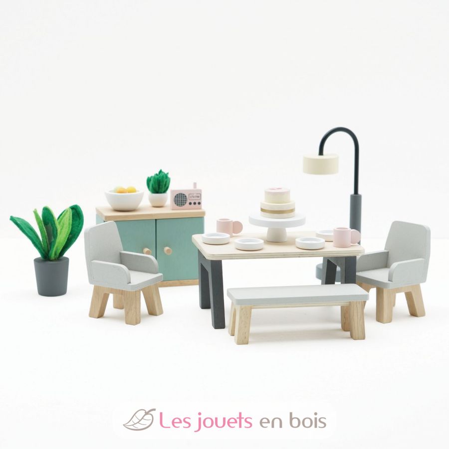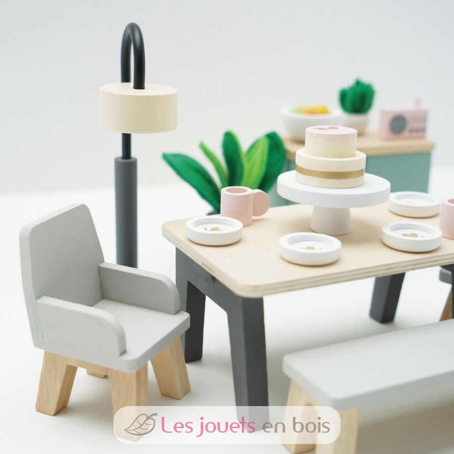 Questo gioco di mobili da sala da pranzo in miniatura per casa delle bambole vanta un delizioso stile contemporaneo che aggiungerà immediatamente un tocco di eleganza a qualsiasi casa delle bambole.