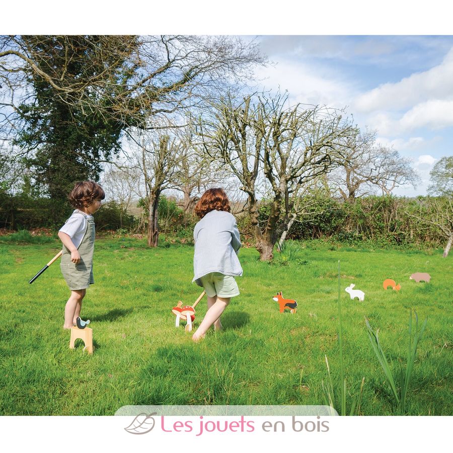 Questo gioco di croquet include 2 mazze (52,5 cm), 2 palline e 6 cerchi per animali.