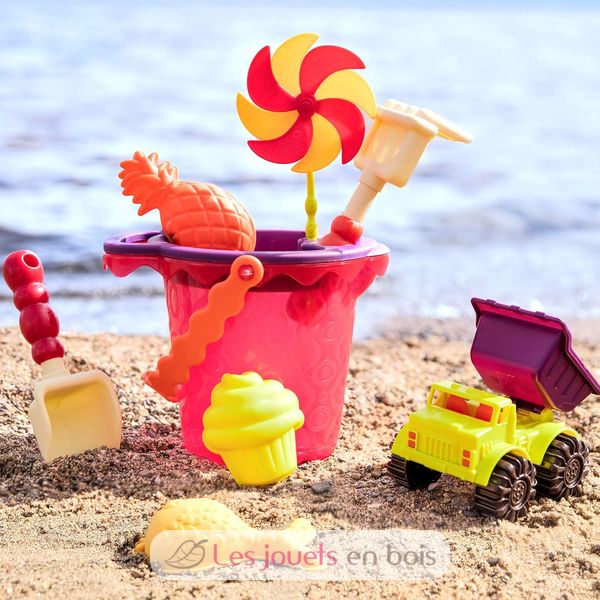 Questo set da spiaggia in plastica è composto da 9 pezzi:1 secchiello con manico, 1 mulino a vento, 1 camion, 3 stampi per la sabbia (a forma di pesce, gelato e ananas), 1 rastrello, 1 pala e 1 setaccio.