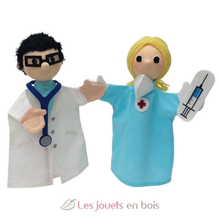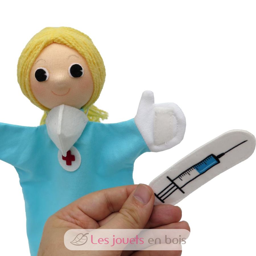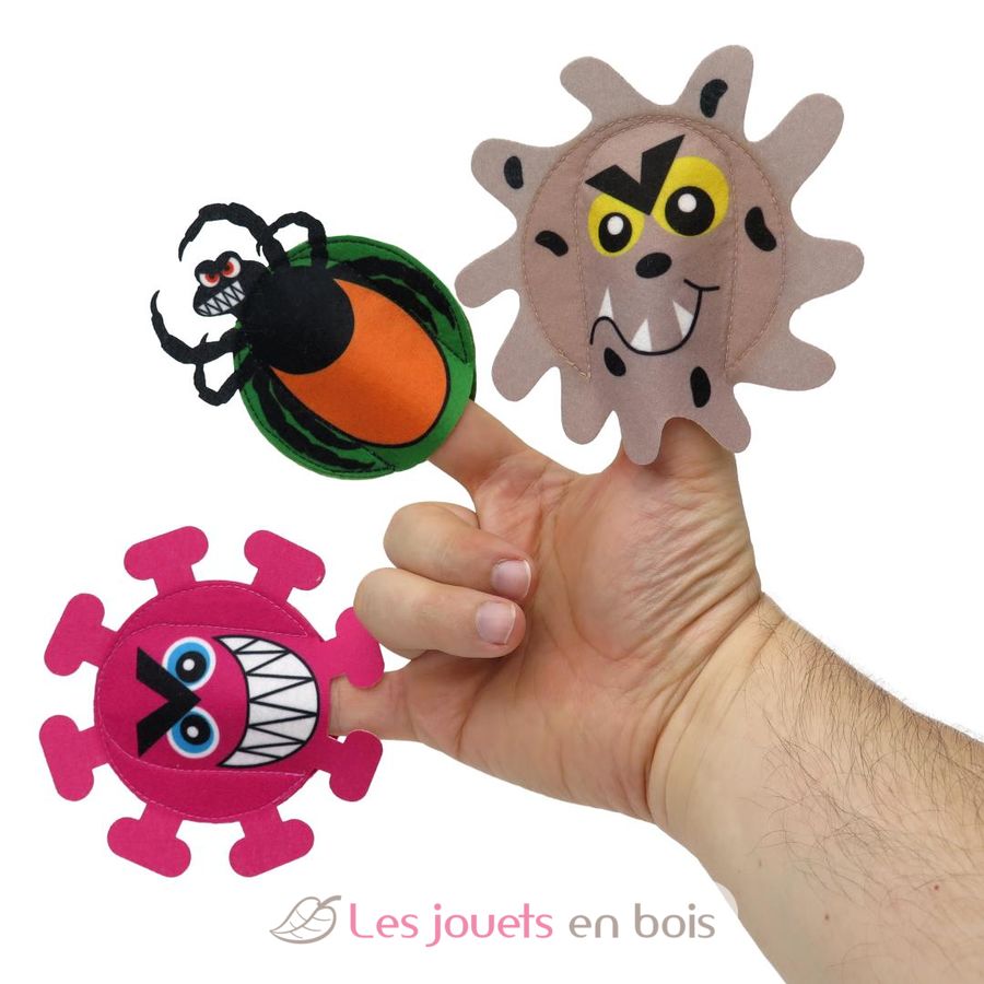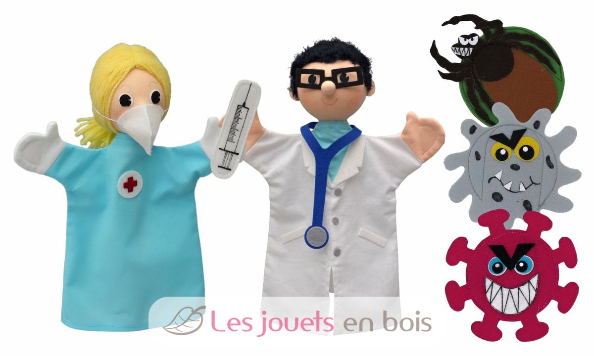 Set di 5 pupazzi. Il dottore e l'infermiera sono marionette a mano. Il coronavirus, l’epatite e le zecche sono marionette da dito. L'infermiera ha una maschera facciale rimovibile e una siringa fissata con velcro.