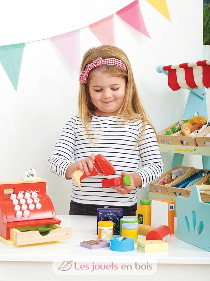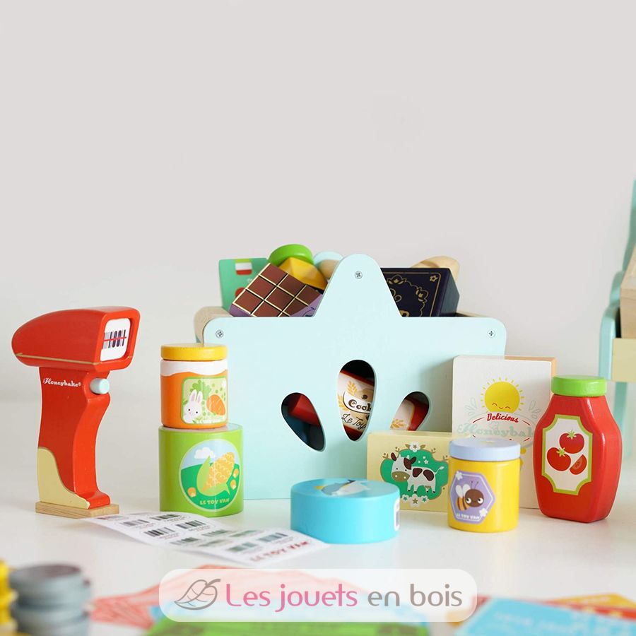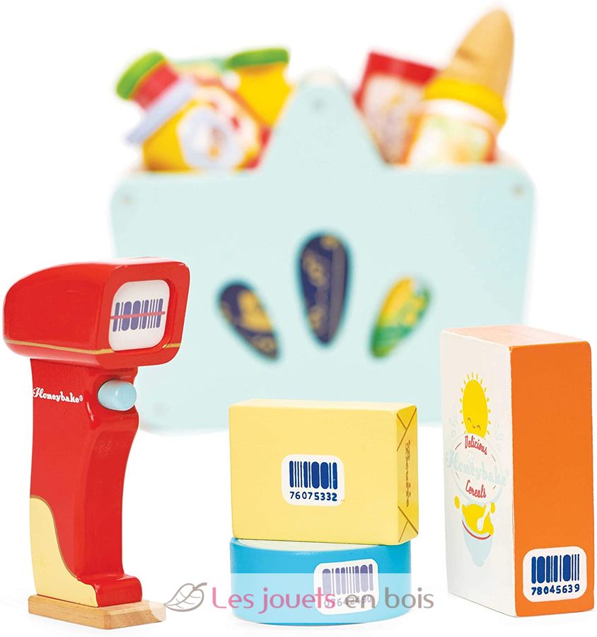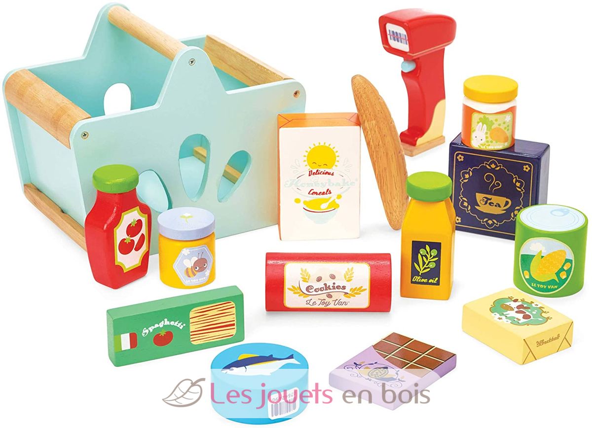 Questo set per la spesa del marchio Le Toy Van comprende un cestino in legno, 13 accessori per la spesa, uno scanner per codici a barre e adesivi per codici a barre.
