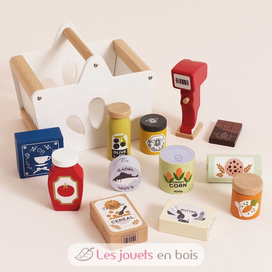 Questo set per la spesa del marchio Le Toy Van comprende un cestino in legno, 11 accessori per la spesa e uno scanner per codici a barre.