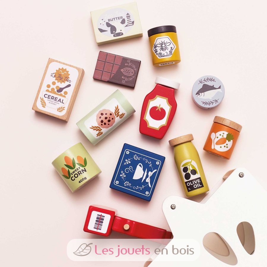 Gli accessori sono realizzati in legno massiccio di gomma e dipinti in colori vivaci e graziosi. Tra questi oggetti di scena per giocare a fare il negoziante o il mercante, troverete una scatoletta di tonno, burro, biscotti, una scatoletta di mais, una scatoletta di piselli e carote, ketchup, olio d'oliva, miele, tè, cioccolato e cereali.