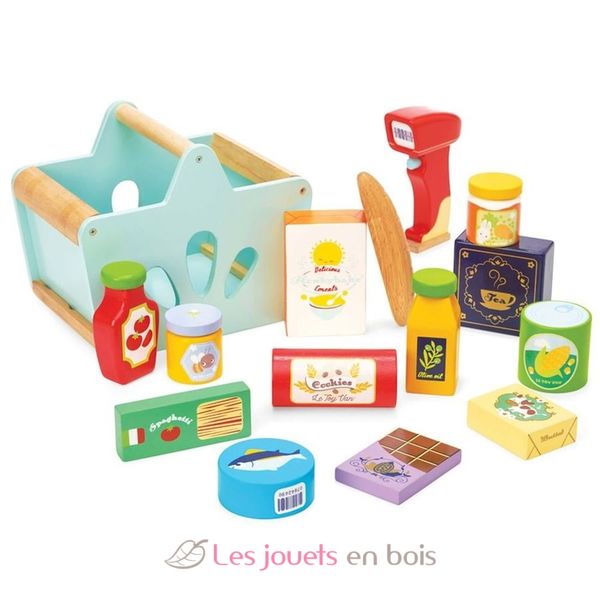Questo set per la spesa del marchio Le Toy Van comprende un cestino in legno, 11 accessori per la spesa e uno scanner per codici a barre.