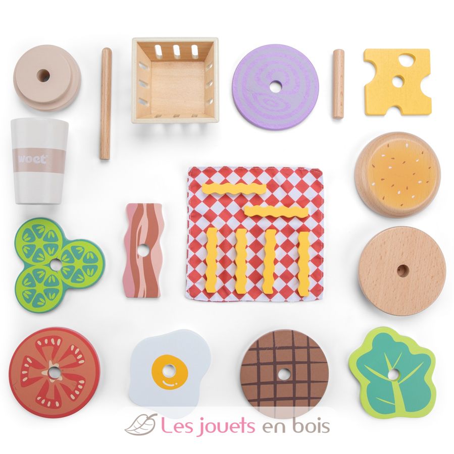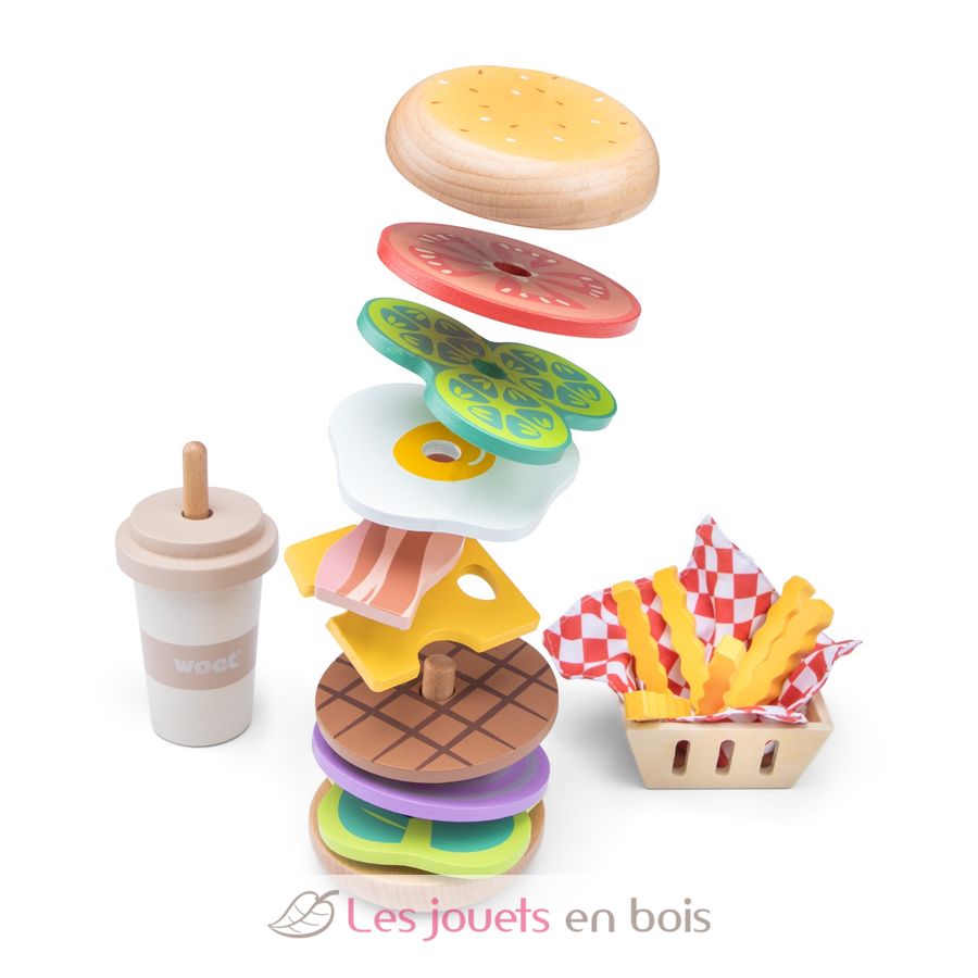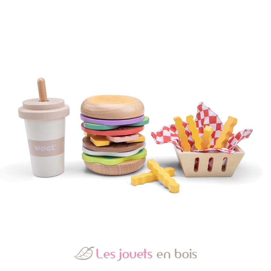 Il set include un hamburger componibile con ingredienti impilabili, un vassoio di patatine fritte e un frullato in legno con cannuccia. I bambini possono mescolare e abbinare i condimenti per creare i loro hamburger preferiti.