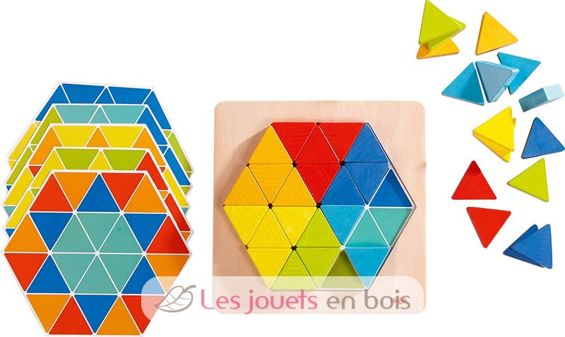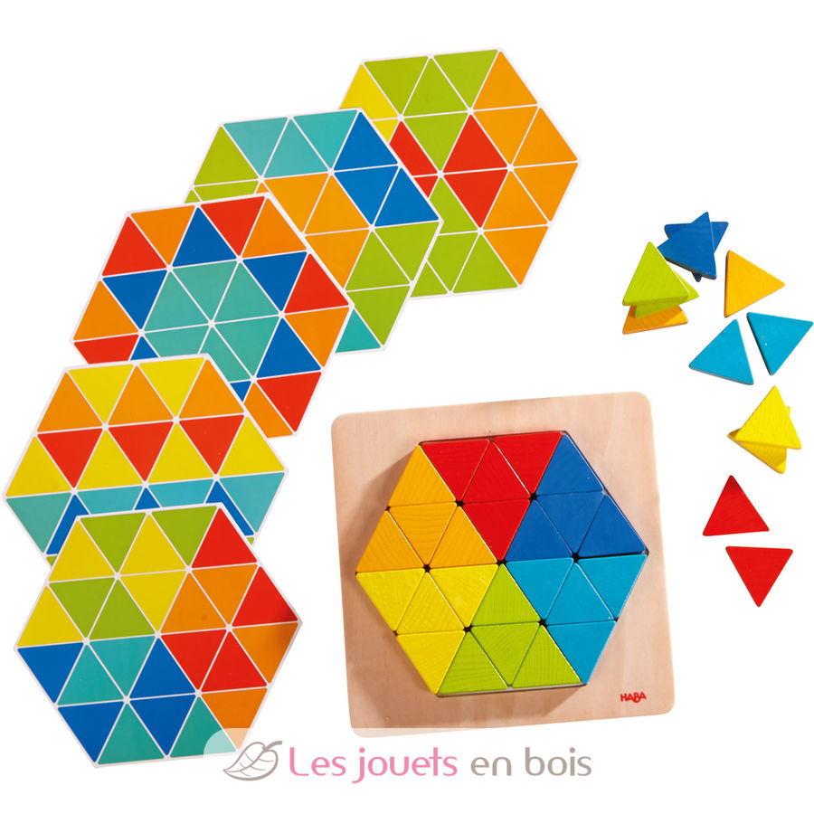 Il bambino ha la possibilità di scegliere: o realizza un assemblaggio multicolore secondo la sua immaginazione, o crea da un modello ordinato, tutto è possibile! I 36 triangoli in 6 colori possono essere assemblati ogni volta in modo diverso nella cornice di legno. In qualunque modo lo si faccia, creando il proprio modello o copiandone uno, il bambino si divertirà sempre molto.