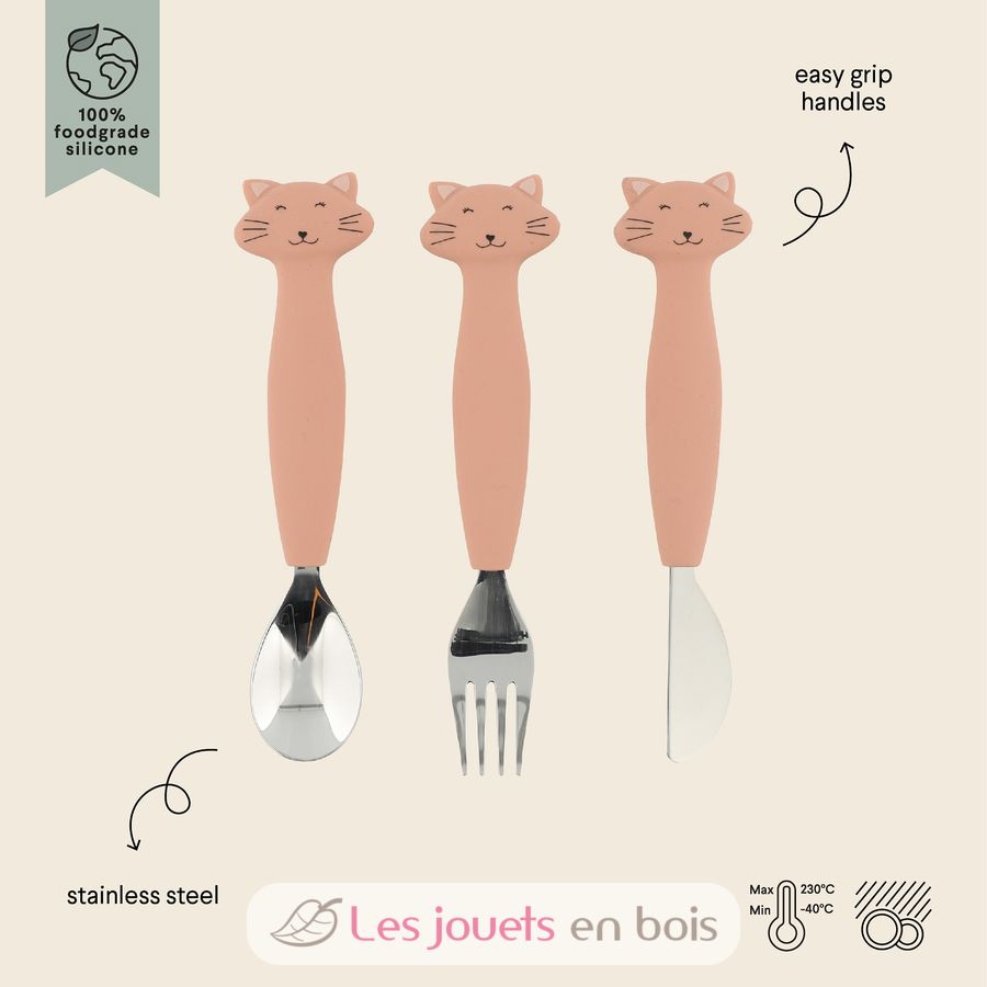 Questo set di posate da 3 pezzi (forchetta, cucchiaio e coltello) è stato appositamente progettato per bambini dai 12 mesi in su.