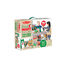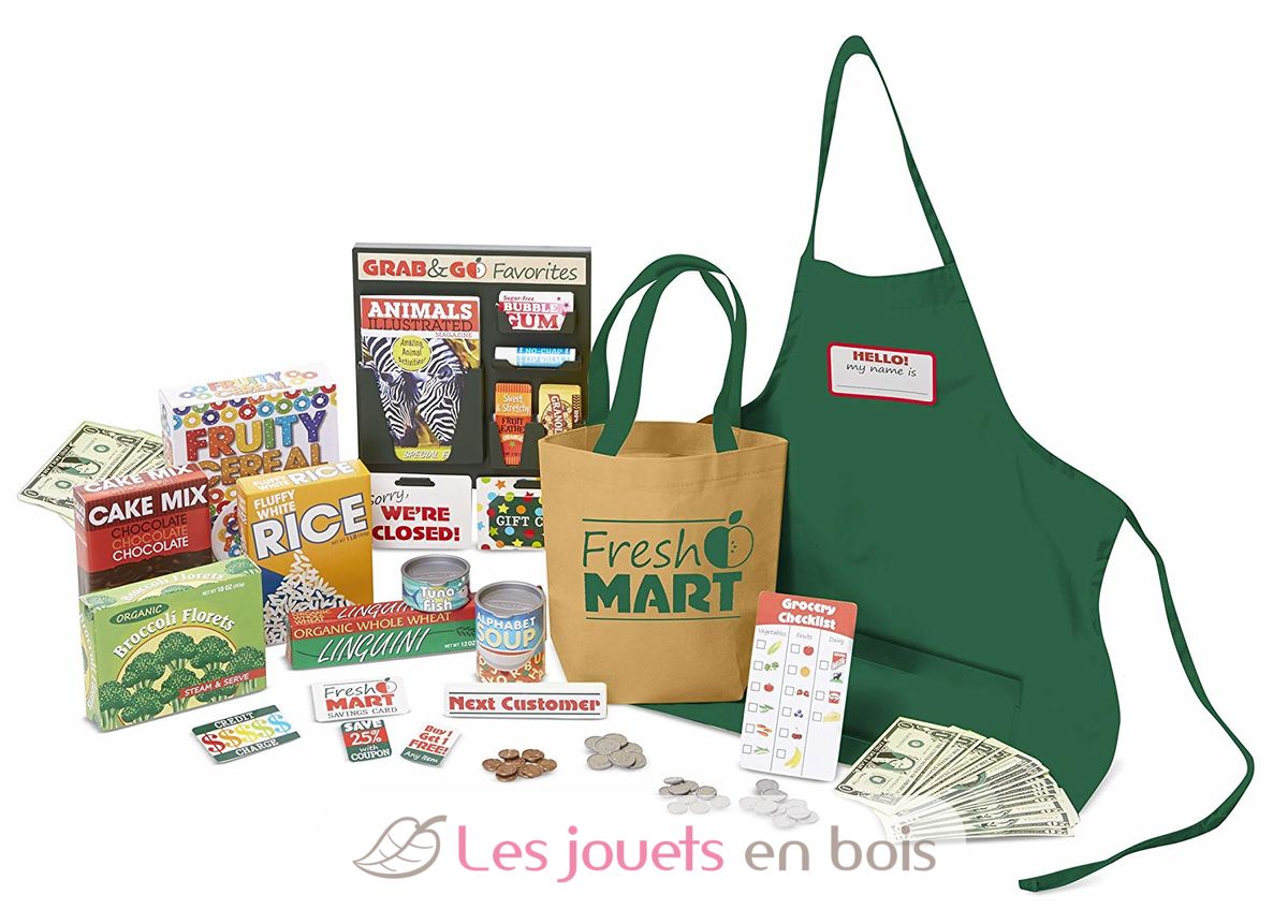 Questo set completo comprende oltre 70 accessori per giocare a fare il negoziante e il mercante: un grembiule, un badge riutilizzabile, una borsa della spesa, 7 scatole di cartone per alimenti, 2 lattine con coperchi di plastica, 20 banconote fittizie, 20 monete fittizie, 2 carte formato portafoglio, 2 coupon, una lista della spesa riutilizzabile, un cartello "apri/chiudi", un divisorio di legno per la cassa...