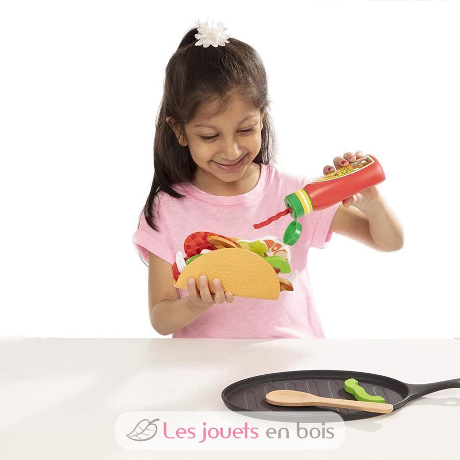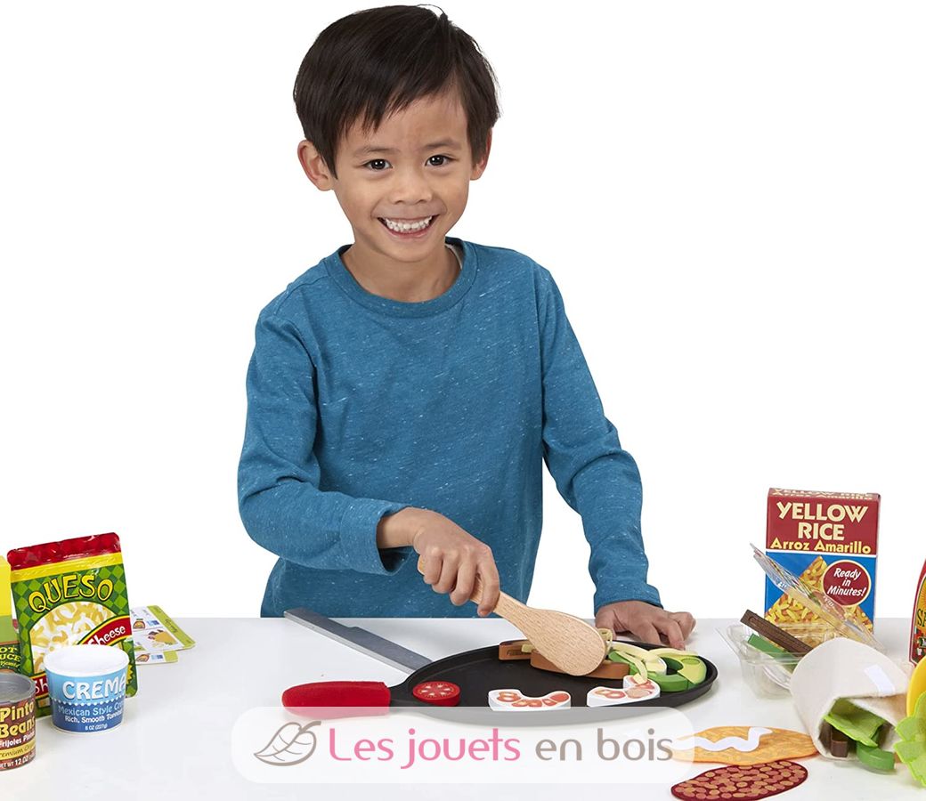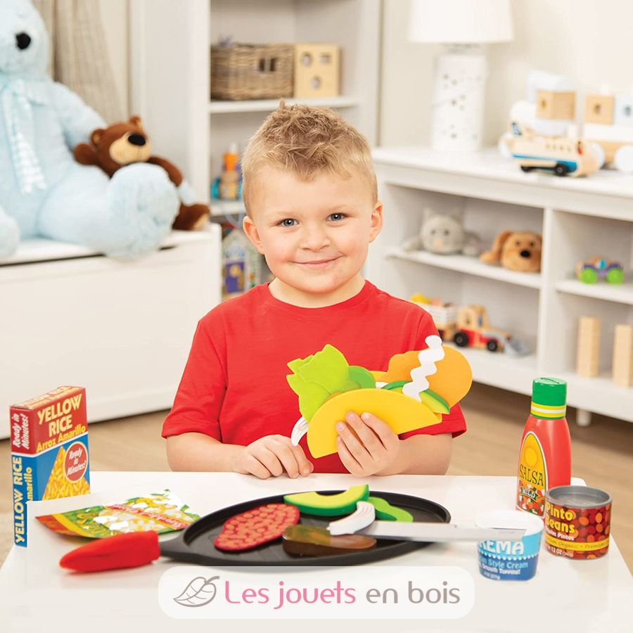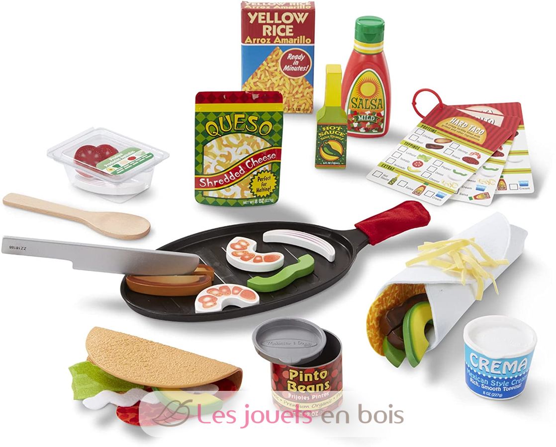 Scegliete gli ingredienti, affettate, grigliate, riempite, piegate e servite deliziosi intrugli. Questo set completo comprende una tortilla in feltro, un taco duro, pollo, manzo e gamberetti in legno, fagioli in scatola con coperchio, riso in scatola, bottiglia di salsa da spremere, formaggio in busta, emabllage con pomodoro, avocado, peperone, cipolla e lattuga in legno, bottiglia di salsa piccante in legno, panna acida in barattolo con coperchio, padella con guanto, cucchiaio e forchetta in legno, 3 schede di ricette e attività riutilizzabili su entrambi i lati.
