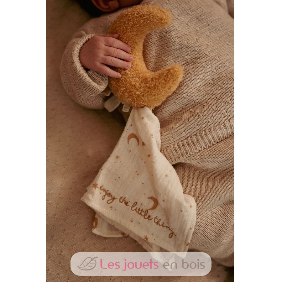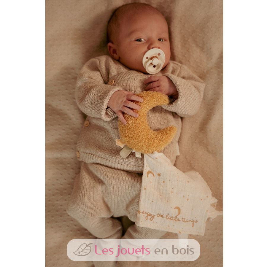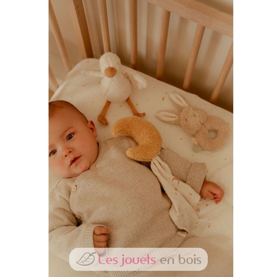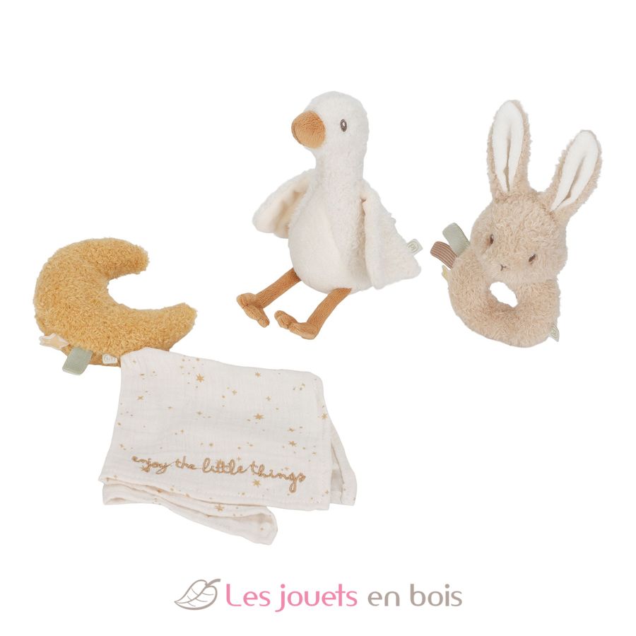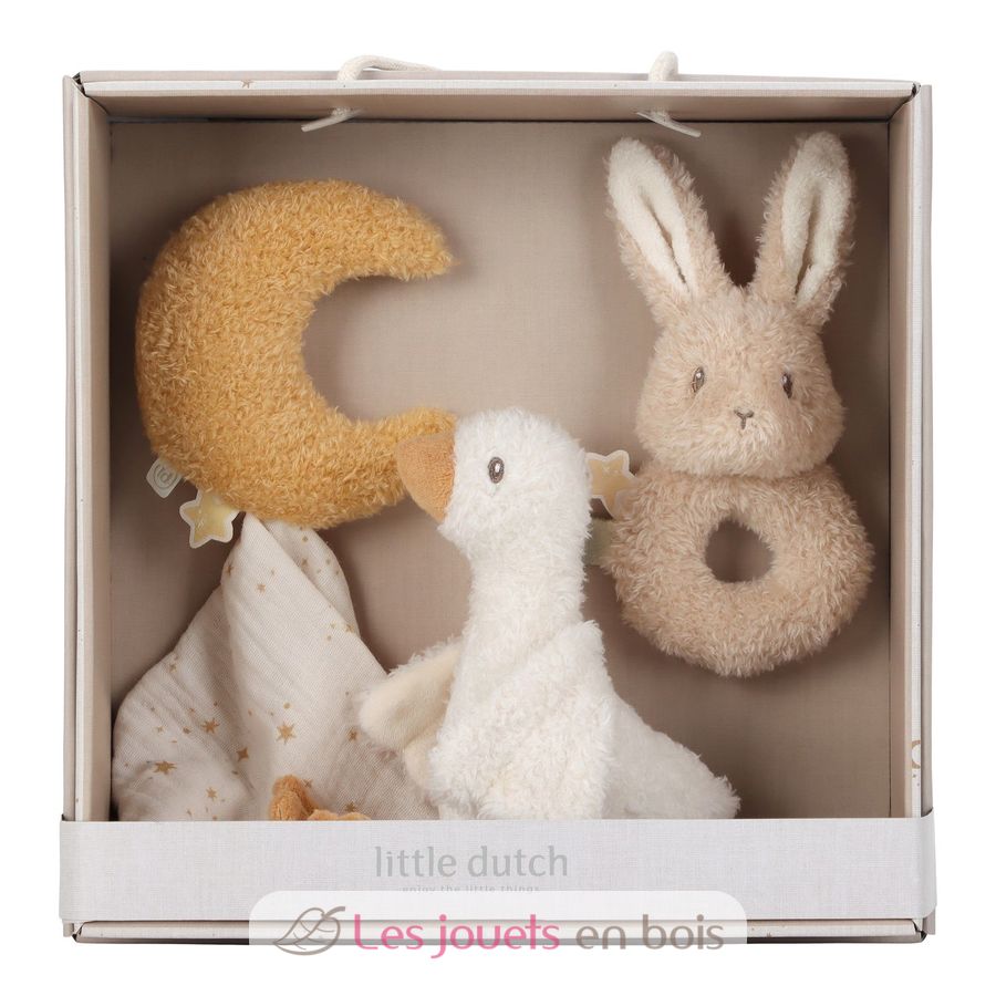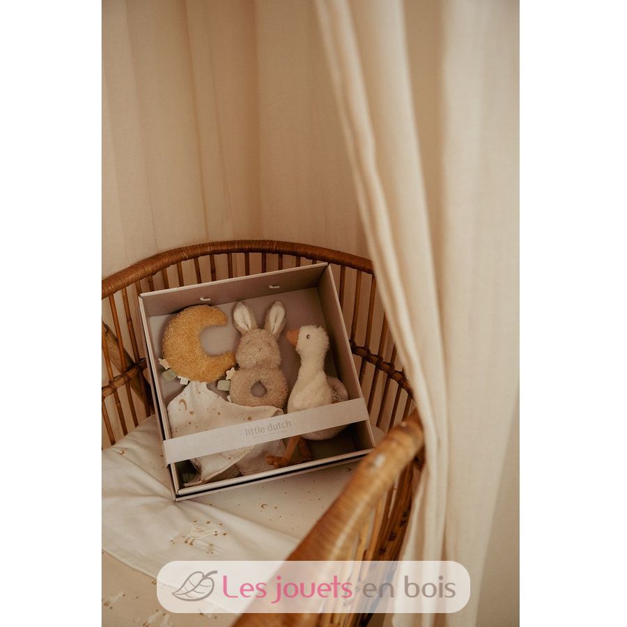 Questa splendida scatola contiene tre morbidi accessori per dormire, coccolarsi e giocare: peluche e un sonaglio.