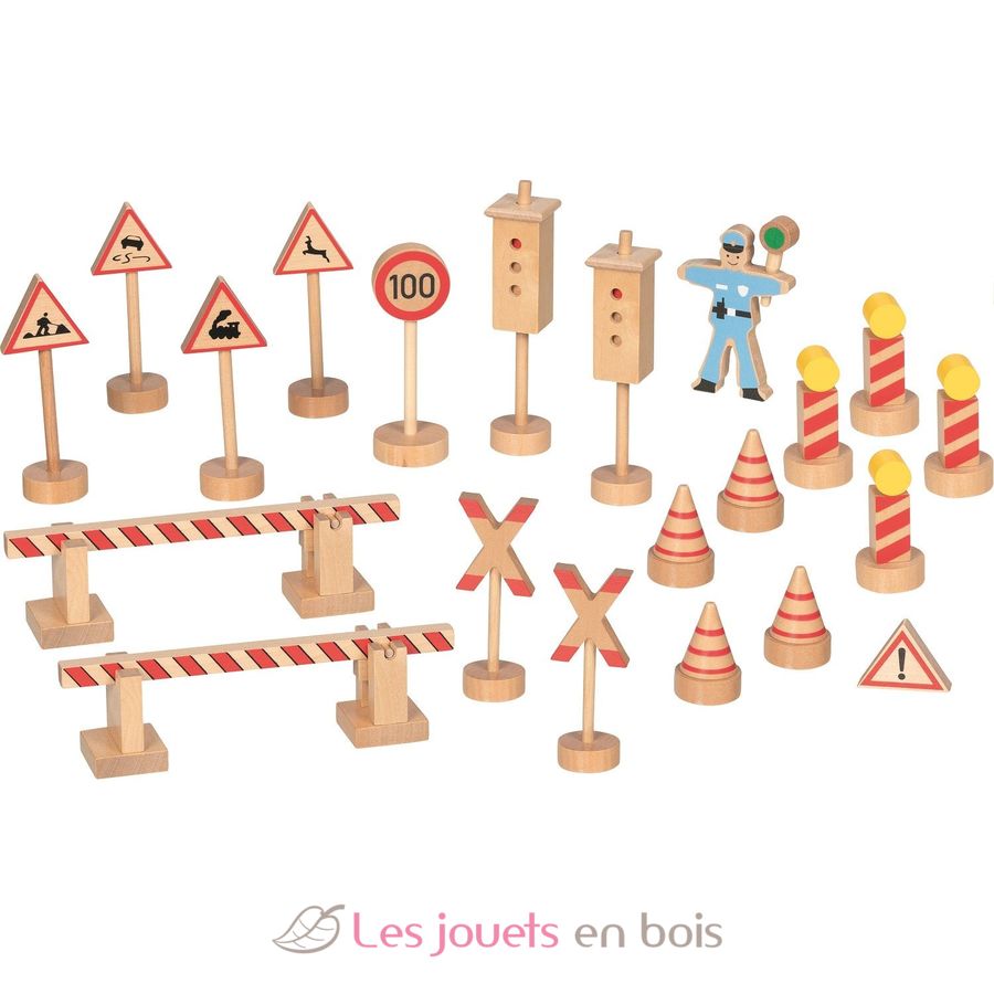 L'agente di polizia Ole è responsabile del traffico. Questo set di 20 segnali stradali in legno gli fornisce tutto il necessario per garantire la sicurezza sulla strada.