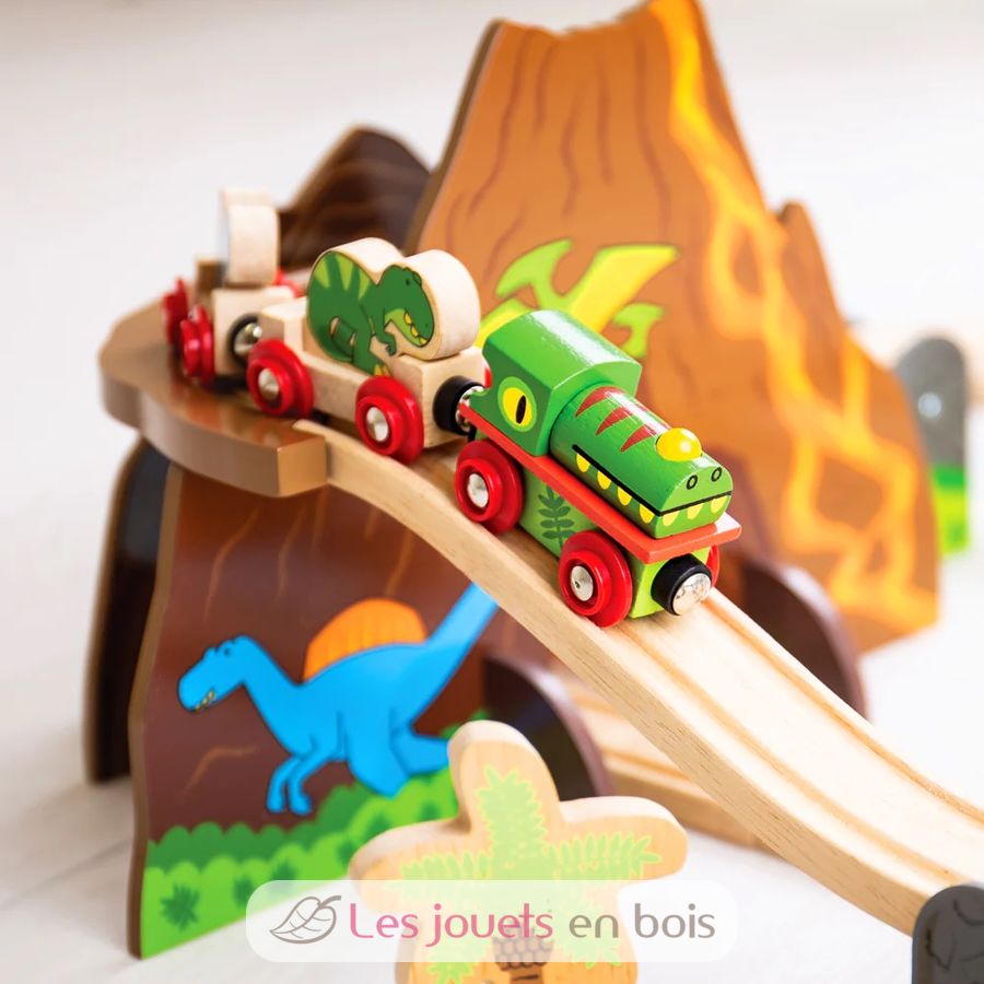 Il mondo dei treni e il mondo dei dinosauri si fondono in questo colorato paesaggio preistorico.