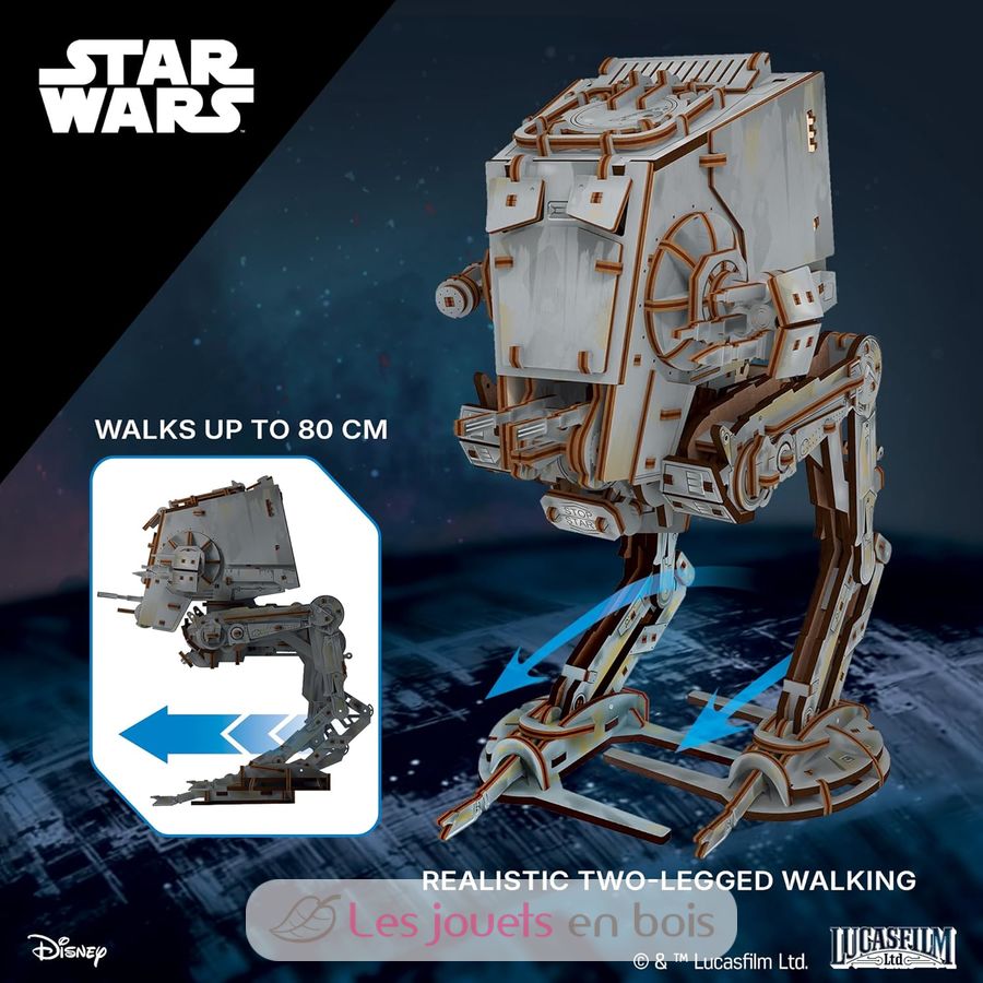 Puzzle 3D in legno a molla dell'iconico esploratore a due zampe. Cammina fino a 80 cm con cabina di pilotaggio girevole, portelli apribili e blaster mobili. Realizzato in compensato colorato con parti metalliche per una maggiore stabilità.